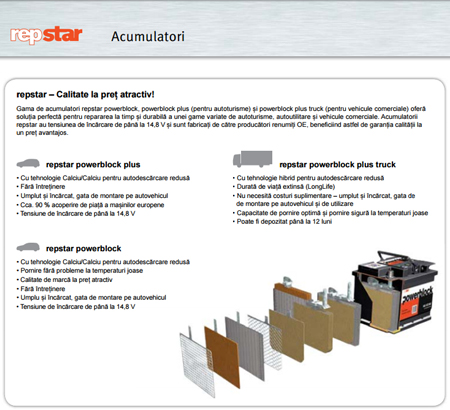 Repstar – Calitate la preț atractiv! Gama de acumulatori repstar powerblock, powerblock plus (pentru autoturisme) și powerblock plus truck (pentru vehicule comerciale) oferă soluția perfectă pentru repararea la timp și durabilă a unei game variate de autoturisme, autoutilitare și vehicule comerciale. Acumulatorii repstar au tensiunea de încărcare de până la 14,8 V și sunt fabricați de către producători renumiți OE, beneficiind astfel de garanția calității la un preț avantajos.